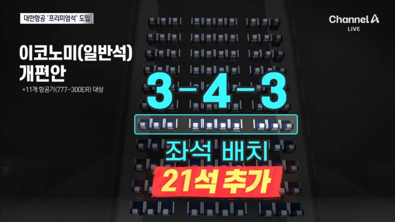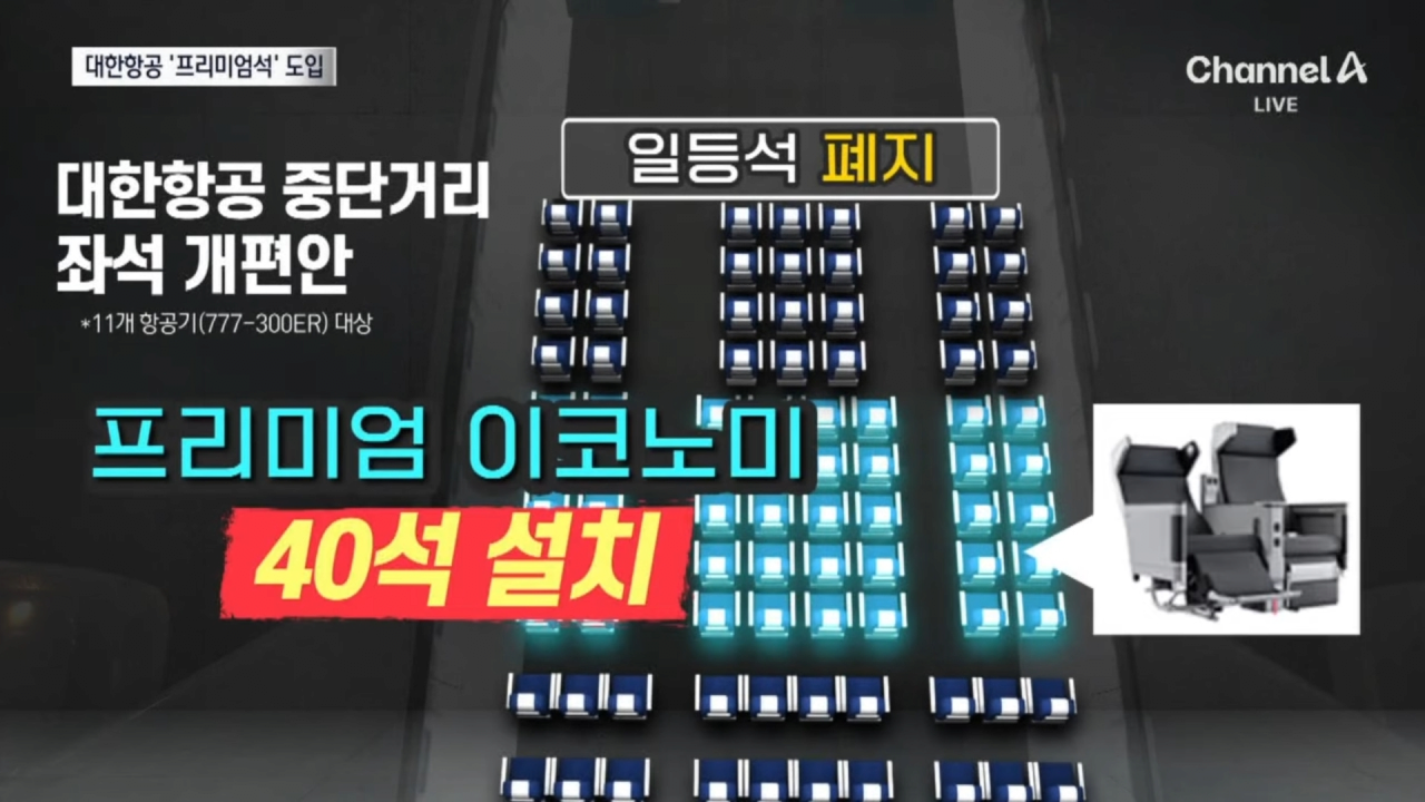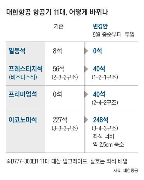 - 당초 일등석을 없애고 프리미엄 이코모니 40석을 추가해 3-3-3에서 3-4-3 구조로 개조 추진했으나 잇따른 불만과 우려에 취소