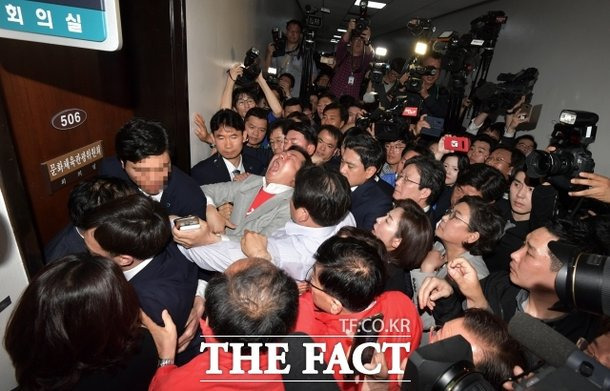 | 자유한국당을 제외한 여야 4당의 선거제 개혁안 패스트트랙(신속처리안건) 지정을 위한 국회 사법개혁특별위원회 전체회의가 지난 2019년 4월29일 오후 서울 여의도 국회 본청 506호에서 진행된 가운데 나경원 원내대표를 비롯한 패스트트랙 반대 의원들이 회의장에 진입을 시도하고 있다./ 더팩트DB |