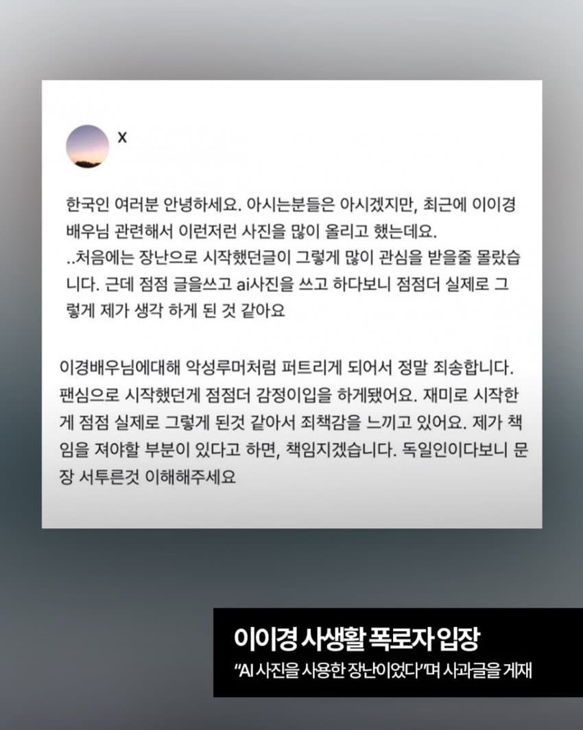 [스크랩] 이이경 조작 독일인 사과문 작성자버거킹매니아|작성시간25.10.22|조회수10,194 목록 댓글 4 글자크기 작게가 글자크기 크게가 한국말 겁나 잘하네 다음검색 스크랩 원문 : 이종격투기 현재 게시글 추가 기능 열기 북마크 공유하기 신고 센터로 신고 댓글 댓글 4 댓글쓰기 답글쓰기 댓글 리스트 작성자댈러스의 사나이 | 작성시간 25.10.22 끝까지 고소 가야죠 작성자호나섹 장 | 작성시간 25.10.22 뭔일 있었나보네요 작성자cu@heaven | 작성시간 25.10.22 과연 독일인일까 ㅎ 작성자풀코트프레스 | 작성시간 25.10.22 고소가야 합니다법적 조치 안하면 돈으로 막았다는 의심이 계속될 겁니다 댓글 전체보기