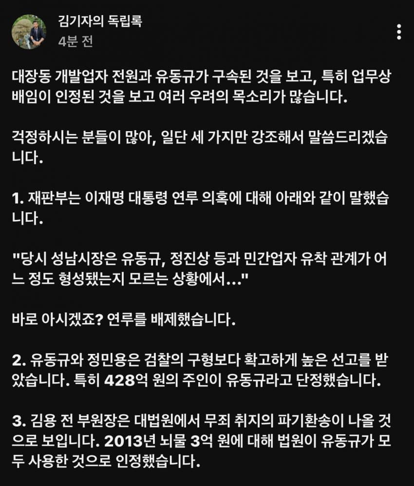 [스크랩] 대장동 전문 기자의 오늘 판결 분석 작성자풀코트프레스|작성시간25.10.31|조회수2,252 목록 댓글 3 글자크기 작게가 글자크기 크게가 이재명은 연루되지 않음 대장동 본체는 유동규 김용은 대법원에서는 무죄 나올거 같음 끗 다음검색 스크랩 원문 : 이종격투기 현재 게시글 추가 기능 열기 북마크 공유하기 신고 센터로 신고 댓글 댓글 3 댓글쓰기 답글쓰기 댓글 리스트 작성자태섭 | 작성시간 25.10.31 유동규 사필귀정! 작성자new독고탁 | 작성시간 25.10.31 조선일보는 반대로썻네요 작성자Shoot as Ray | 작성시간 25.10.31 파기환송하고 조작범들 넣어주시구요 댓글 전체보기