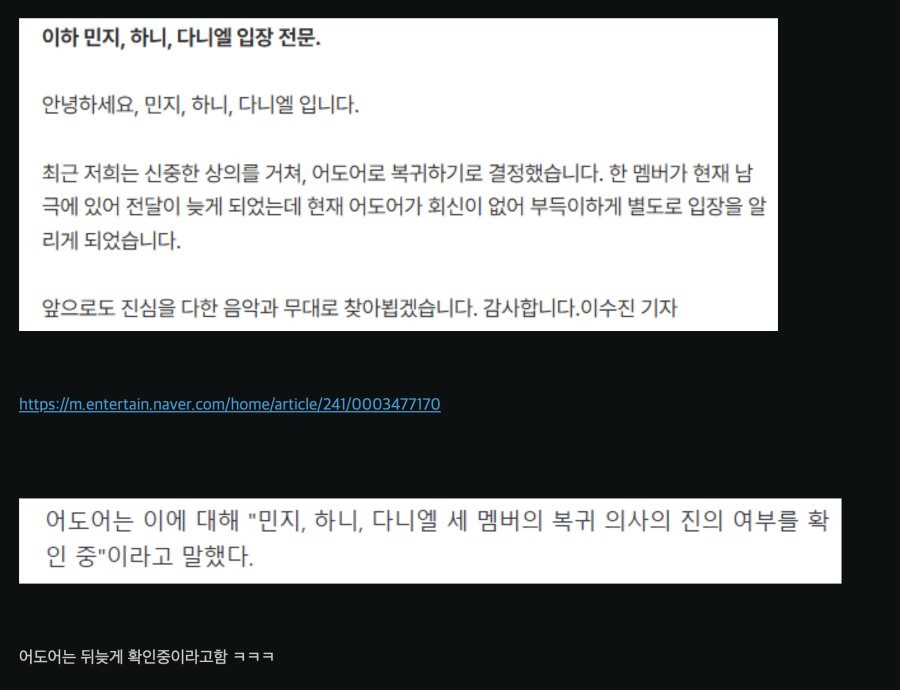 해린, 혜인은 어도어랑 상의하고 복귀인데