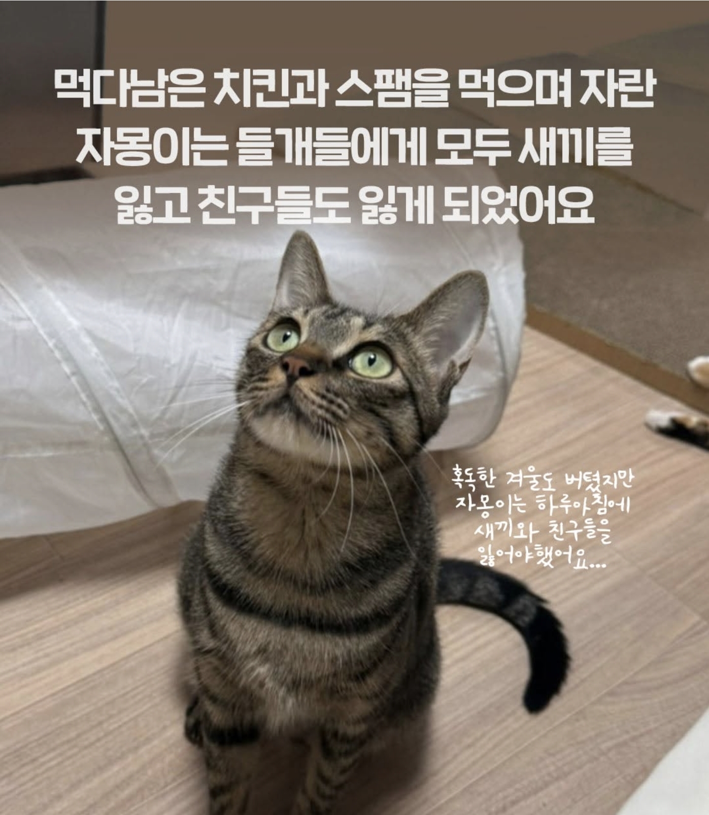 작성자airtime3 작성시간 25.11.20 정말 좋은 일 하셨습니다. 와이프 만삭일때 길에서 과자 부스러기 줏어먹던 어미잃은 새끼 3마리가 가여워 임보 후 입양시킨 후 지금까지도 소식 받고 있었는데, 어제 그 중 한마리가 암으로 무지개다리 건넜단 소식을 들었습니다. 12살이 넘은 나이라 자연사라해도 그러려니 하겠지만 제일 활발했던 기억에 있던 놈이라 뭔가 먹먹하더군요.