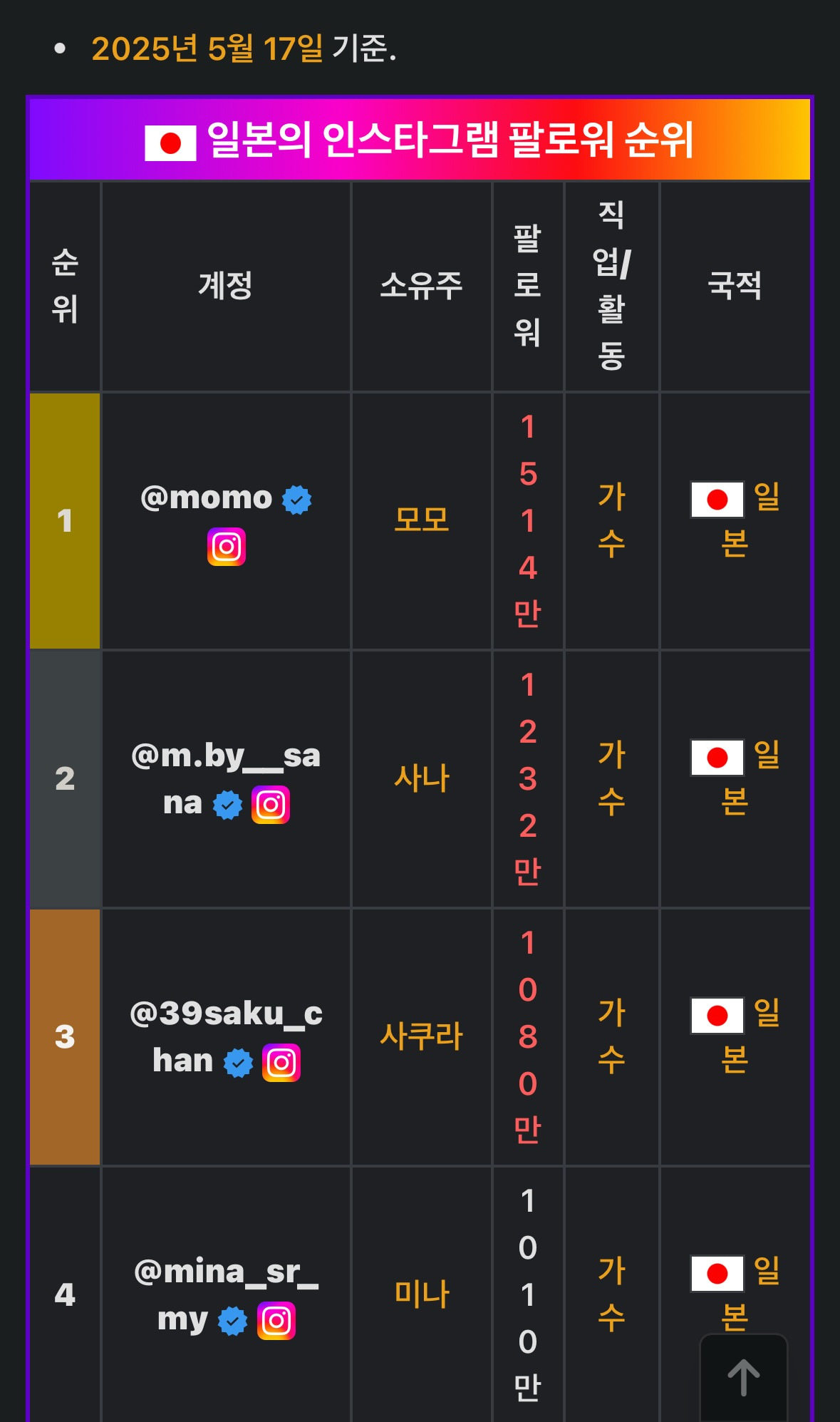 일본인 인스타 팔로워 숫자 랭킹
