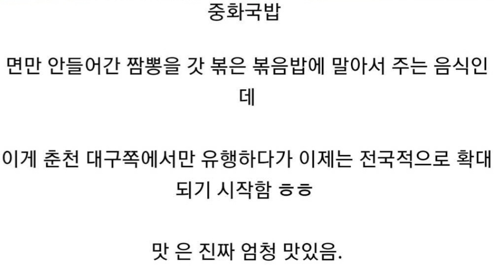 [스크랩] 전국적으로 유행 조짐이 보인다는 중식 메뉴 작성자Jason-Kidd|작성시간26.01.10|조회수9,323 목록 댓글 20 글자크기 작게가 글자크기 크게가 다음검색 스크랩 원문 : 이종격투기 현재 게시글 추가 기능 열기 북마크 공유하기 신고 센터로 신고 댓글 댓글 20 댓글쓰기 답글쓰기 댓글 리스트 작성자리바운드머신 | 작성시간 26.01.11 국물이 기름둥둥 돠는거 아닌가요ㄷㄷ 작성자HEATShaq32 | 작성시간 26.01.11 느글느글 할 거 같네요 작성자풀코트프레스 | 작성시간 26.01.11 이게 지역메뉴였구나 작성자▶◀ 예측불허 | 작성시간 26.01.11 대구에서 잘 못 봤는데 ㅎㅎㅎ 잘 안 돌아다니긴 하지만 작성자연후아빠 | 작성시간 26.01.12 부산에는 중화덮밥, 중화비빔밥이 많이 보이네요.맛과 스타일은 케바케 댓글 전체보기