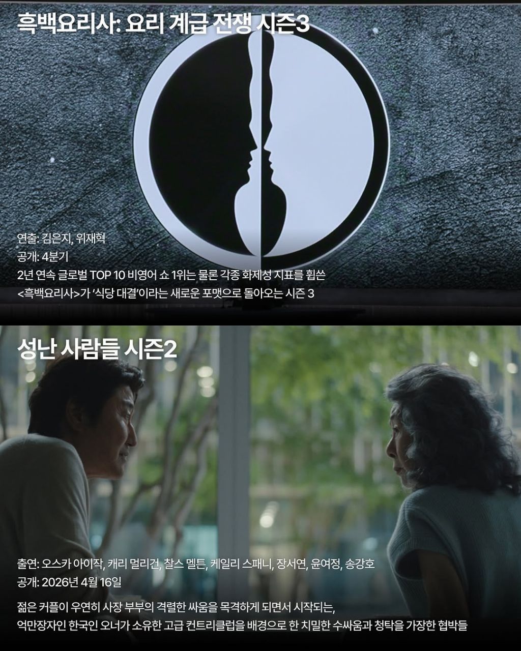 [스크랩] 2026 넷플릭스 한국 작품 라인업 작성자제이미 라니스터|작성시간26.01.23|조회수5,338 목록 댓글 10 글자크기 작게가 글자크기 크게가 다음검색 스크랩 원문 : 한류열풍 사랑 현재 게시글 추가 기능 열기 북마크 공유하기 신고 센터로 신고 댓글 댓글 10 댓글쓰기 답글쓰기 댓글 리스트 작성자농구좋아ㅎ | 작성시간 26.01.23 탄탄하네요 정말 작성자날아라바레아 | 작성시간 26.01.23 오!! 성난 사람들!!!! 작성자인생이다그럴뻔 | 작성시간 26.01.23 아무리 어려워도 영화계가 이창동 감독님을 품지 못하다니...좀 서글프네요. ㅜㅜ 작성자어떤이의 꿈 | 작성시간 26.01.24 가능한 사랑 이창동 감독님 기대되네요 작성자둠키 | 작성시간 26.01.24 크로스는 그렇게 재미없기도 힘들었는데 2도 나오나요? 댓글 전체보기