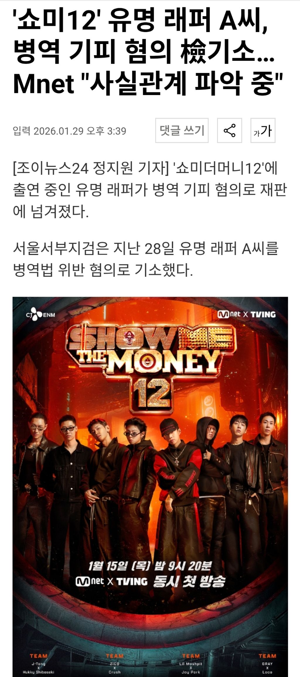 [스크랩] '쇼미12' 유명 래퍼 A씨, 병역 기피 혐의 檢기소…Mnet "사실관계 파악 중 작성자Jason-Kidd|작성시간26.01.29|조회수7,856 목록 댓글 21 글자크기 작게가 글자크기 크게가 평소엔 돈자랑 여자자랑을 목놓아 부르다가 정말 필요할땐 한없이 하남자가 되어버리는 그분들..97년생이고 벌써 나무위키 실검 뜸 다음검색 스크랩 원문 : 樂soccer 현재 게시글 추가 기능 열기 북마크 공유하기 신고 센터로 신고 댓글 댓글 21 댓글쓰기 답글쓰기 댓글 리스트 작성자스파이크 | 작성시간 26.01.29 정말 이 게시물을 통해 첨들어 보내요 판단가 뭔가다들 딱 주댕이만 살아있는 것들이네요 작성자[NSNL]Delta Center | 작성시간 26.01.30 국내레퍼중 정상인을 찾기 참 어렵네요 작성자3점마스터 | 작성시간 26.01.30 오늘도 찬혁승 작성자Insector | 작성시간 26.01.30 이럴수록 딘딘 노래만 찾아 듣게 됨 작성자converge | 작성시간 26.01.30 역시 힙찔이들 댓글 전체보기