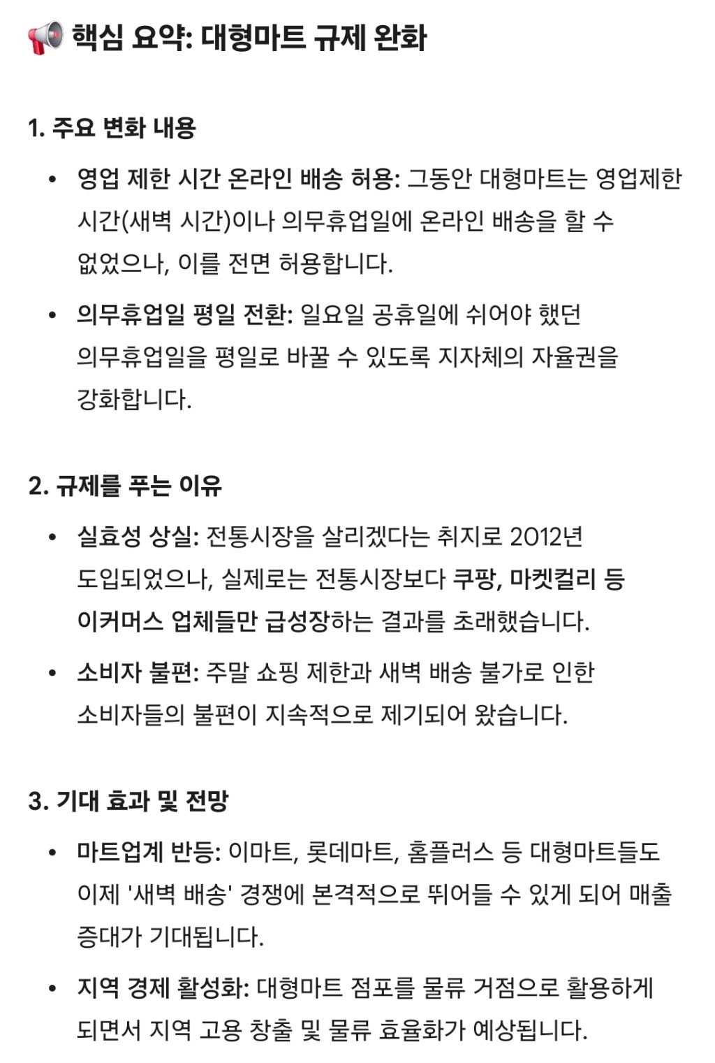작성자키드가 되고싶어요~~^^;; 작성시간 26.02.05 환경이 바뀌었으니 법안과 규제도 바뀌는게 맞죠 어차피 대형마트 갈 사람이 주말휴업 야간휴업 시킨다고 해서 시장이나 작은 마트가는 횟수가 많지 않을겁니다 사실상 쿠팡이 독점한 물류환경이라도 다시 분배해야죠