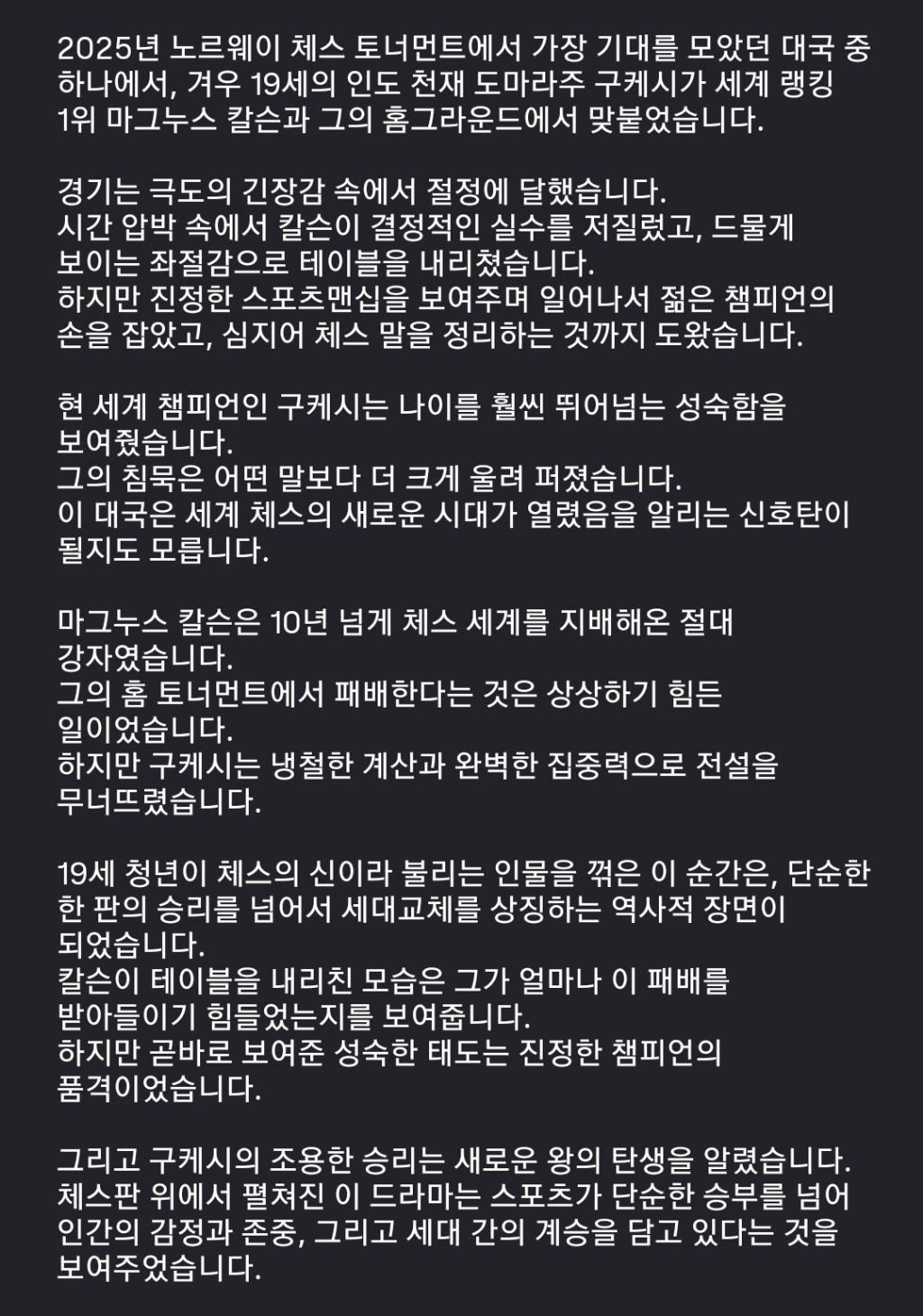 [스크랩] 2025년 노르웨이 체스 전설이 무너진 순간 작성자정인신선|작성시간26.02.09|조회수5,251 목록 댓글 4 글자크기 작게가 글자크기 크게가 다음검색 스크랩 원문 : 이종격투기 현재 게시글 추가 기능 열기 북마크 공유하기 신고 센터로 신고 댓글 댓글 4 댓글쓰기 답글쓰기 댓글 리스트 작성자Messi | 작성시간 26.02.09 깜짝 놀람 ㅎㅎ 작성자Quentin Tarantino | 작성시간 26.02.09 칼슨 ㅋㅋㅋ 답댓글 작성자Quentin Tarantino | 작성시간 26.02.09 근데 텍스트 자체는 sns 뉴스 계정 특유의 과장이 좀 있는듯요 여전히 세계 최고의 선수는 칼슨이 맞죠 작성자cu@heaven | 작성시간 26.02.09 여전히 지금 폼 그대로봐도 칼슨이 최강이고 goat도 칼슨이라 생각합니다 댓글 전체보기