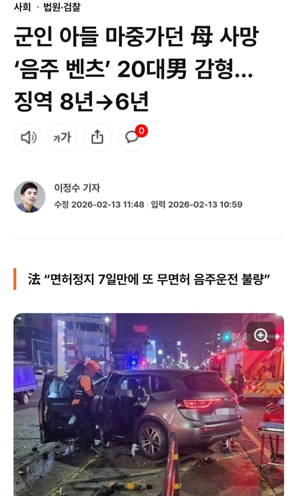 작성자matthew 작성시간 26.02.13 음주로 인한 무면허에 재범인데다가 가중처벌 할 사안 겹쳤는데, 합의했다고 감형해준건지...