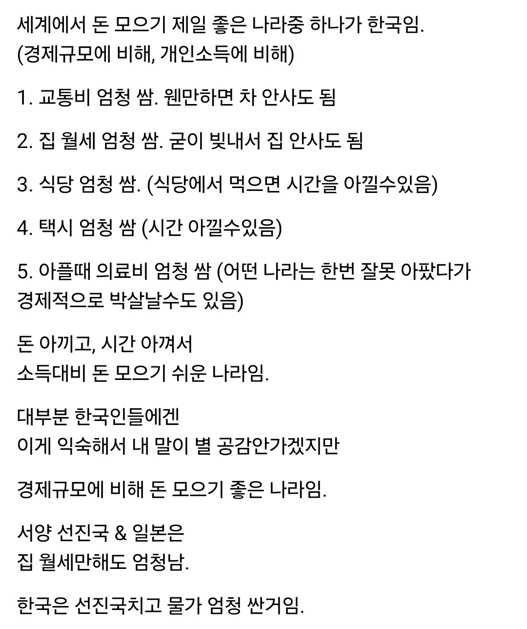 작성자Miami Hate 작성시간 26.03.04 서울빼면 한국 살기좋은것 맞습니다. 인천 거주중인데 정상적으로 회사 다니고 아껴쓰면 집한칸은 살수가 있죠. 일단 내명의로된 집있고 평균수준의 급여만 받으면 그럭저럭 살아집니다. 해외의 경우 후진국에 살더라도 한국수준의 퀄리티를 누리려면 한국보다 돈 더 듭니다.