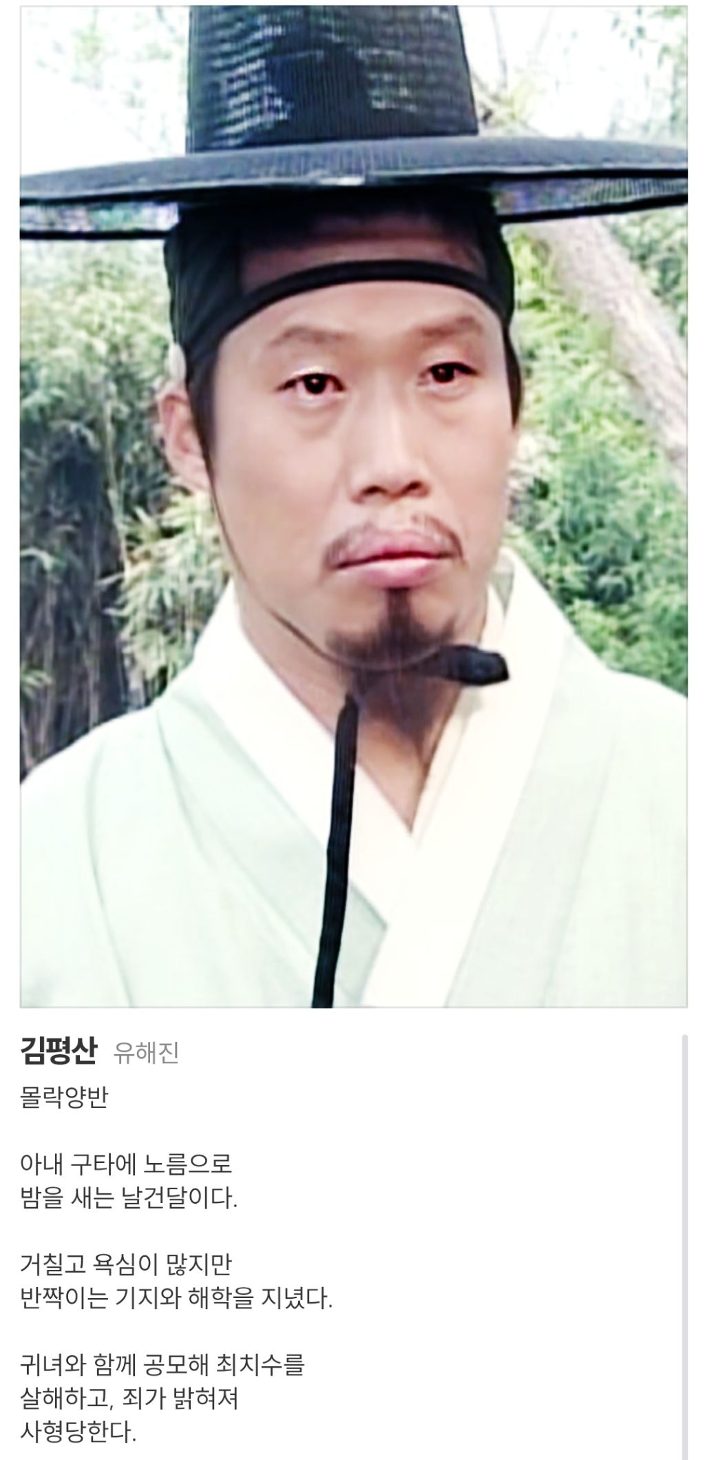 몰락한 양반 출신으로, 자신의 욕망을 위해 주인공 최서희(배우 김현주, 아역 신세경)의 아버지인 최치수를 살해하는 데 가담하는 등 극 초반 결정적인 악인 "김평산"