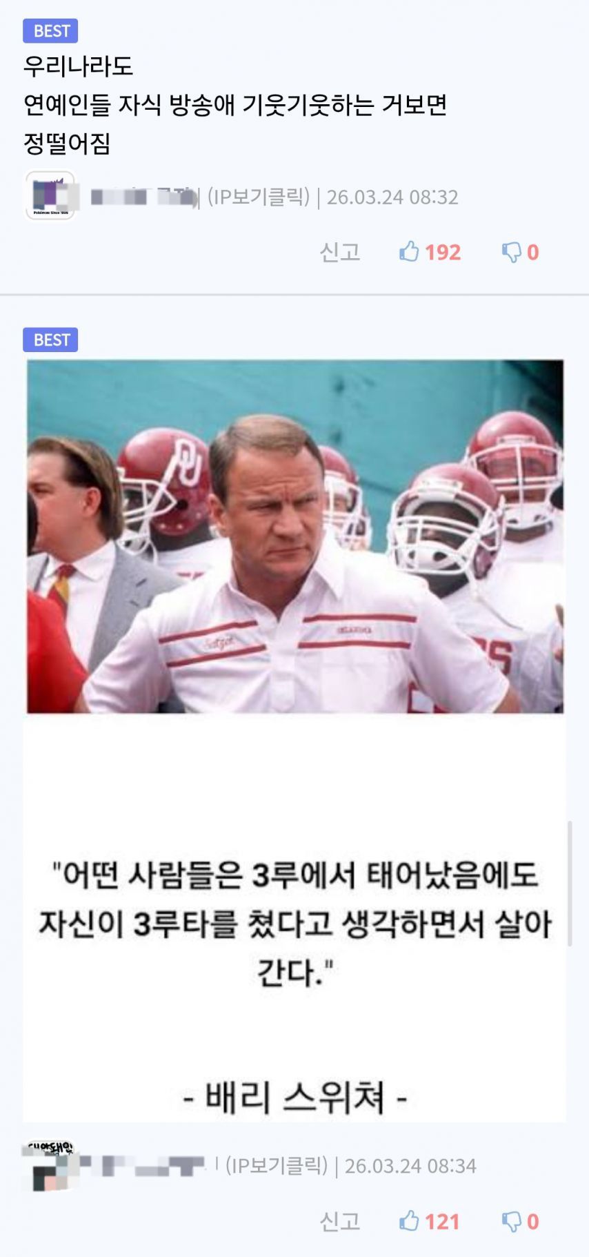 작성자air-time 작성시간 26.03.30 연예인들은 자기들 직업 너무 힘들다고 하고선, 자식들 어디에 꽂으려고 엄청 노력하죠. 그럼 그 힘들다는 말이 설득력이 없어지죠. 그냥 징징이 되는겁니다.