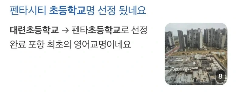 [스크랩] 올해 개교한 포항의 초등학교 이름. 작성자정인신선|작성시간00:07|조회수2,620 목록 댓글 8 글자크기 작게가 글자크기 크게가 이제 초등학교도 아파트 이름처럼 다음검색 스크랩 원문 : 이종격투기 현재 게시글 추가 기능 열기 북마크 공유하기 신고 센터로 신고 댓글 댓글 8 댓글쓰기 답글쓰기 댓글 리스트 작성자빌바오 | 작성시간 01:12 new 단지 아파트.. 작성자데이빗스턴 | 작성시간 05:16 new 저기 신도시 자체 이름이 펜타시티라 작성자사월동글 | 작성시간 07:20 new 도로명 주소부터 펜타시티네 ㅋㅋㅋ세종이나 일산처럼 ~마을로 이름 짓는거 엄청 예쁘던데 저긴 반대로 됐네여ㅜㅠ 작성자Manu | 작성시간 10:03 new 부산에도 센텀초, 센텀고 다 있어서.. 작성자웃겨라 동해야 | 작성시간 1시간 34분 전 new 한국 케이팝 고등학교도 충격적이었네요 댓글 전체보기