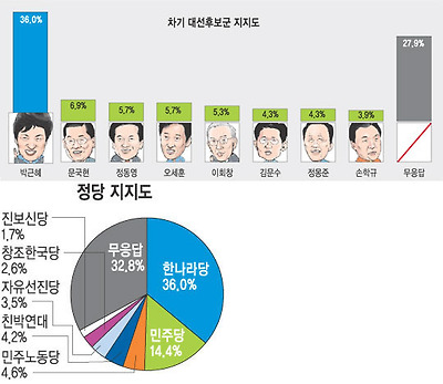 작성자레드존 작성시간 08.12.17 박근혜는 지방의 노인들 고정표가 있다치자... 오세훈,정몽준,김문수가 저기 끼어있는건 진짜 개그다... 아 왜 전여오크도 끼워넣지그랬어..ㅉㅉ
