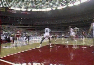 뒤에서 따라오던 마이클 조던에게 백보드를 이용해 전달한 노-룩 앨리웁 패스,
