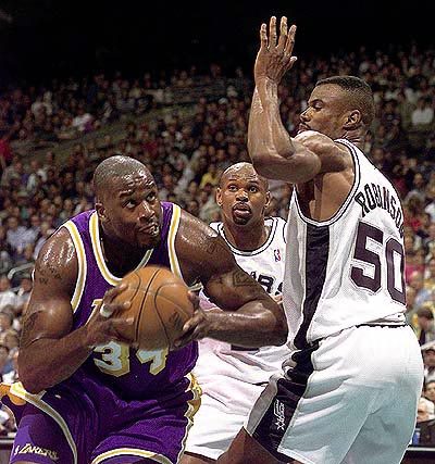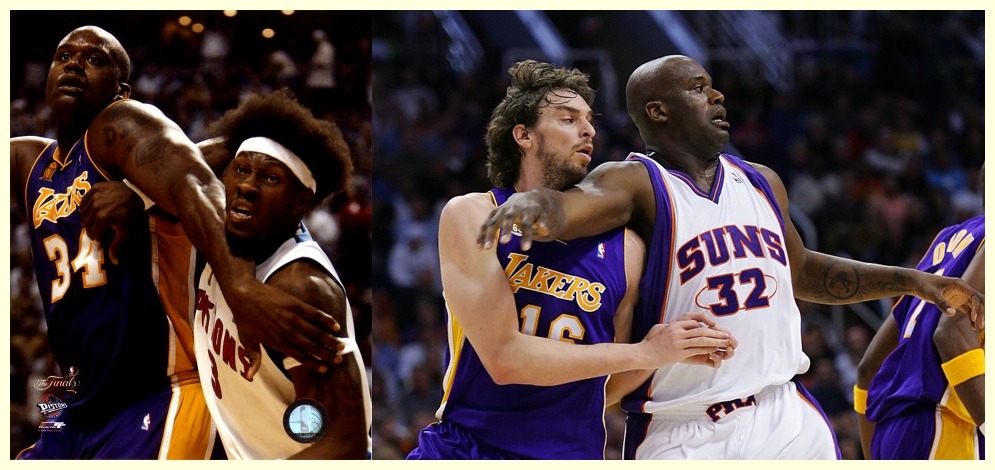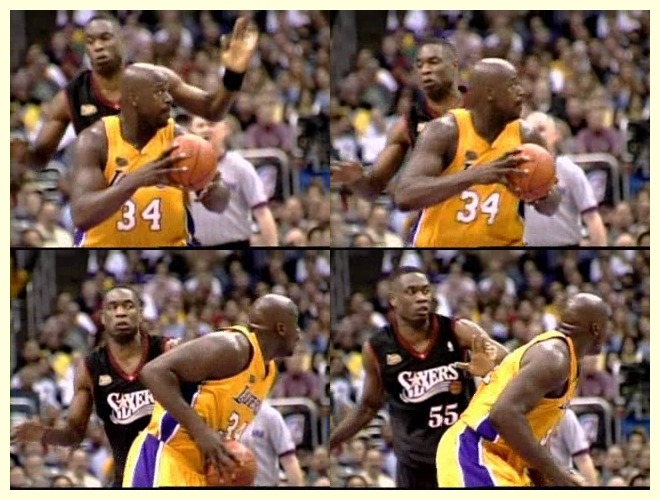 샤킬 오닐은 NBA 역사상 가장 많은 노골적인 상대편의 집단 수비 샌드위치를 받은 선수일겁니다. 온갖 스킬을 다 갖춘데다가 파워와 높이가 무시무시하고 득점력도 리그 1,2위를 다투는 스코어러였기 때문에 오닐이 페인트존에 자리를 잡으려 하면 상대편 빅맨 모두가 신경을 곤두세워야 했고, 그가 페인트존에서 공을 잡으면 상대편 전체가 오닐부터 신경을 썼습니다.