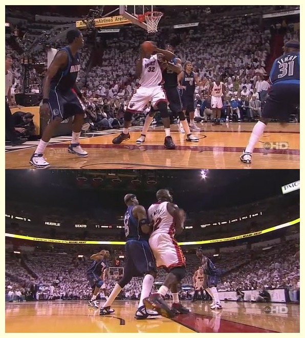 웨이드가 건드린 공격 리바운드를 잡자마자 야오밍과 스콜라가 압박 더블팀을 붙고 베티에가 골밑의 웨이드까지 차단하여 패스마저 줄 곳이 없는 저 상황에서, 공을 잡는 순간 곧바로 펌프페이크와 함께 쏜살같은 피벗무브로 야오밍을 따돌리고, 금방 따라붙은 베티에의 헬프디펜스와 뒤에서 블락샷을 시도하는 야오밍의 높이를 현란한 스텝을 두차례 밟으며 가볍게 뚫고 들어가 이지 레이업을 넣고 바스켓 카운트까지 얻어내는 장면입니다. 야오밍, 스콜라, 베티에같은 한다 하는 수비수들이 세 명이나 붙은 상황에서 저 손바닥만한 좁은 공간에서 그 짧은 시간에 그 세 명을 피벗과 정교한 풋웍만으로 모두 물리치고 바스켓 카운트를 얻어내고 있으니, 저 현란한 동작의 연속기는 샤킬 오닐이라는 선수가 얼마나 기술면에서 수준높은 세련된 선수인지를 단적으로 드러내는 것이죠.