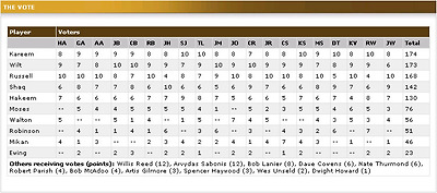 샤킬 오닐의 35번째 생일에 즈음하여 ESPN.com에서는 전문가 20명으로 패널을 구성하여 역대 최고의 센터를 선정했습니다. 전문가 한 명이 1위에게는 10점, 2위에게는 9점, 그리고 10위에게는 1점을 부여하는 방식으로 투표를 실시했습니다.