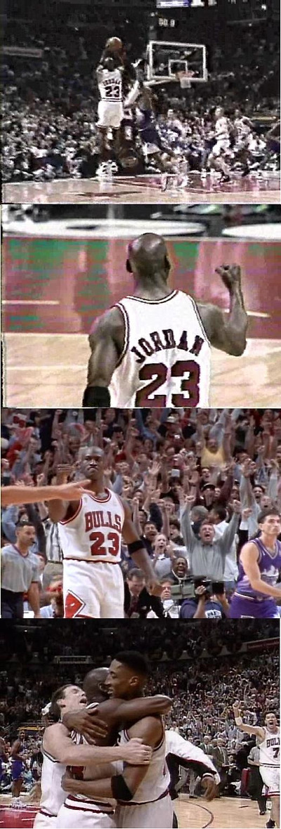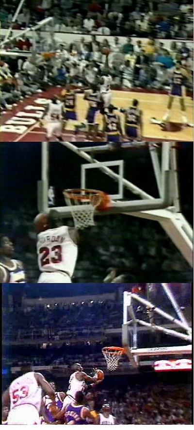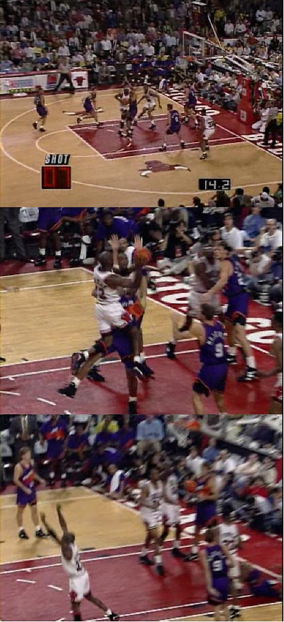조던은 마지막 공격에서 더블팀이 오는 것을 보고도 과감한 드라이브인을 선택, 더블팀을 돌파하여 그를 막아선 바클리 위로 솟아올라 스쿱샷을 꽂아넣고 바스켓 카운트를 성공, 경기를 승리로 이끕니다.