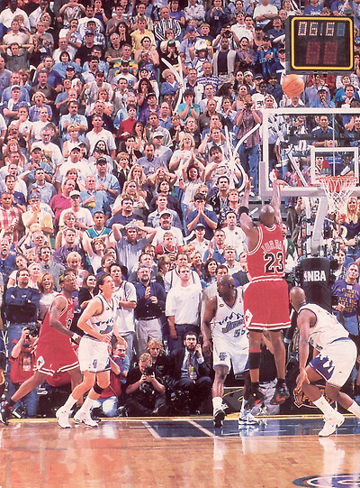 mvp를 보유한 칼 말론과 통산 어시스트 1위 존 스탁턴의 두 명의 전설이 이끄는 유타 재즈를 상대로 한 첫번째 결승전에서 조던은 승리를 결정짓는 짜릿한 버저비터를 성공시켰습니다.