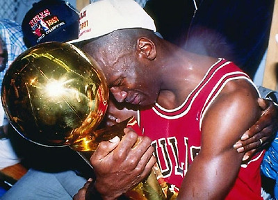 우승이 결정되자 조던은 종료 부저와 함께 농구공을 껴안고 코트에 쓰러져 흐느꼈고, 라커룸에 들어가서 또다시 서럽게 웁니다.