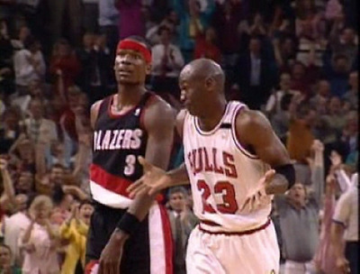 1992년 파이널 1차전부터 동서 최고의 슈팅가드의 자웅을 가리는 첫 대면에서 조던은 전반 삼점슛 6개라는 nba 파이널 기록을 세우면서 삼점슛 세례를 퍼붓고 승부를 결정지어버립니다.
