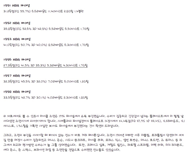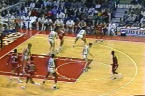 (1985년입니다. 셀틱스 왕조가 루키 조던을 수비하는 이 장면만 봐도 그에게 집중되는 수비의 정도를 알 수 있습니다.)