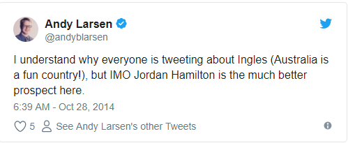 어째서 모두가 잉글스에 관하여 트윗을 했는지 이해합니다만(호주는 재미있는 나라입니다!), 제 생각에 조단 해밀턴이 훨씬 더 유망한 선수입니다.