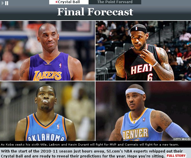 ROBSON : Lebron james 르브론이 3년연속으로 수상할 것이다. 왜냐하면, 마이애미는 지난2년간 캐브스가 달성했던 승수비슷하게 달성 할 것이고, 르브론의 리바운드와 어시스트는 늘어날지도 모르기 때문이다. 듀란트가 매우 뛰어난 성적으로 르브론과 박빙의 레이스를 벌일 것이고, 결국은 내쉬가 2번째 MVP를 수상하던 상황과 비슷하게 전개될 것이다. 코비는 플레이오프를 기다리며 준비할 것이고, top5에 들지 못할 것이다.