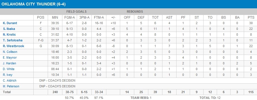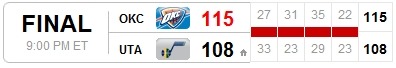 듀란트 : 30점 6리바 2스틸 자유투(16-16)/웨스트브룩 : 22점 7어시 1스틸 /이바카 : 22점(9-13) 11리바 1스틸 4블록