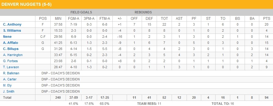 앤써니 : 20점 22리바 1스틸 / 아프랄로 : 15점 7리바 / 해링턴 : 14점 5리바 2스틸 / 빌럽스 : 14점 / 네네 : 14점