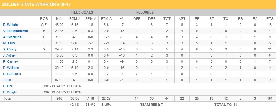 몬타 엘리스 : 27점 1스틸 / 커리 : 21점 5리바 4어시 2스틸 /도렐 라이트 : 16점 7리바 6어시 /윌리엄스 : 14점 1블록