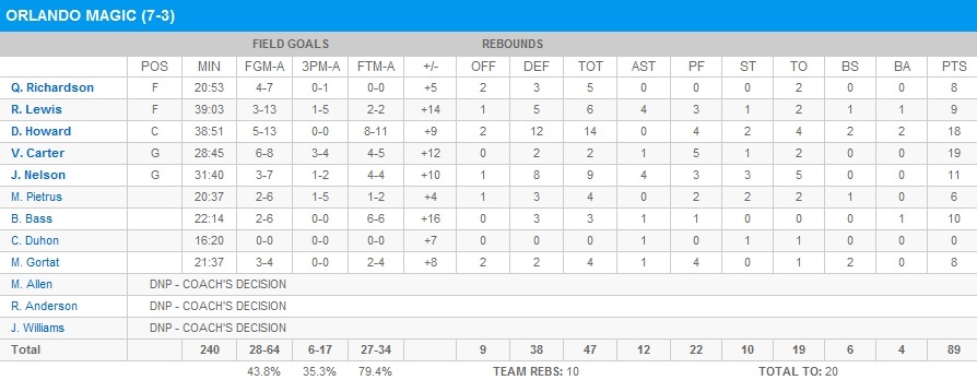하워드 ; 18점 14리바 2스틸&블록 / 빈스 카터 : 19점 1스틸 / 넬슨 : 11점 9리바 4어시 3스틸 / 배스 : 10점 3리바