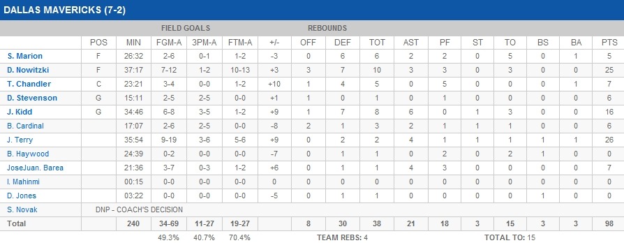 노비츠키 : 25점 10리바 3어시 / 제이슨 테리 : 26점 4어시 1스틸&블록 / 키드 : 16점(6-8) 8리바 6어시 1스틸