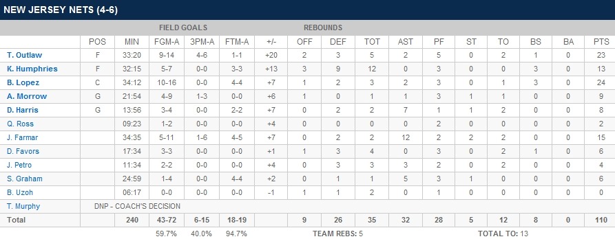 아웃로 : 23점 5리바 1블록 / 로페즈 : 24점 3리바 3블록 / 험프리스 : 13점 12리바 3블록 / 파마 : 15점 12어시 2스틸