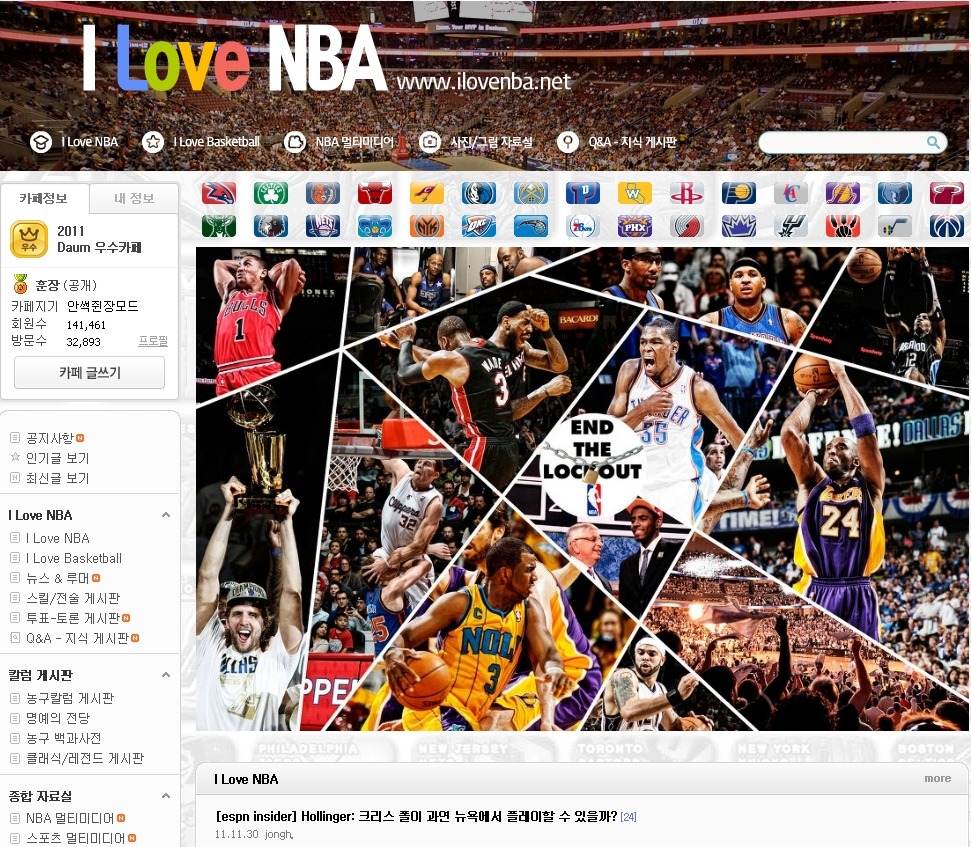 카페 타이틀은 밋밋해보이던 검은색 바탕에 I LOVE NBA 대신 엄청난 관중에 경기장을 배경으로 삼았고,