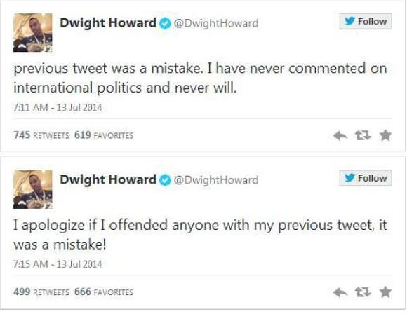 하워드 Dwight Howard도 #FreePalestine에 동조하는 트윗을 올렸다가 곧 삭제하고 사과문구를 게재했다.