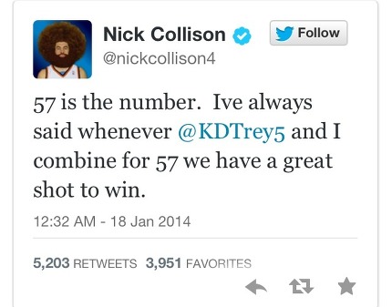 칼리슨 Nick Collison은 듀란트가 54점을 넣은 날 자신과 듀란트의 57점으로 승리했다고 트윗했다.