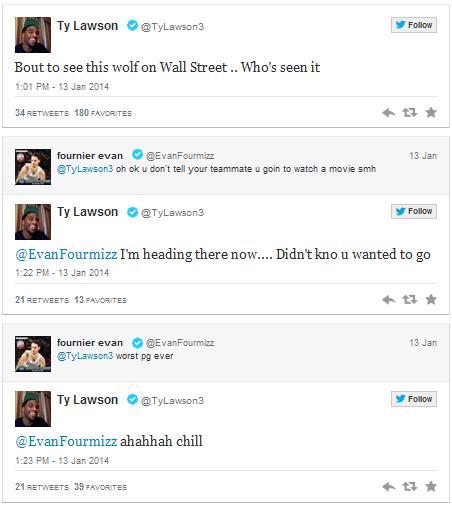 포니에 Evan Fournier는 로슨 Ty Lawson이 영화 ‘울프 오브 월 스트리트’를 보러간다고 트위터에 남긴 몇분 후 자신에게 말하지 않았다며 트위터에 글을 남겼다.