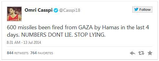 카스피 Omri Casspi는 첫 번째 이스라엘 출신 NBA 선수다. 그도 트위터에 팔레스타인에 관한 글을 올렸다.