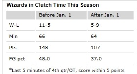 ▶ 오늘 GSW에게 패한 WAS는 1월1일전까지 경기종료 5분전 5점차 이내 경기에서 66분동안 148점(FG 48%), 11승5패를 기록했던 위져즈는 그 이후의 14경기에선 64분동안 107점(FG 37%)과 함께 5승9패의 저조한 성적을 보이고 있습니다. 또, WAS는 1월1일부터 오늘 경기가 열리기전까지 11승14패를 기록하였고, 이 성적은 동부지구에서 10번째로 높은 성적입니다.