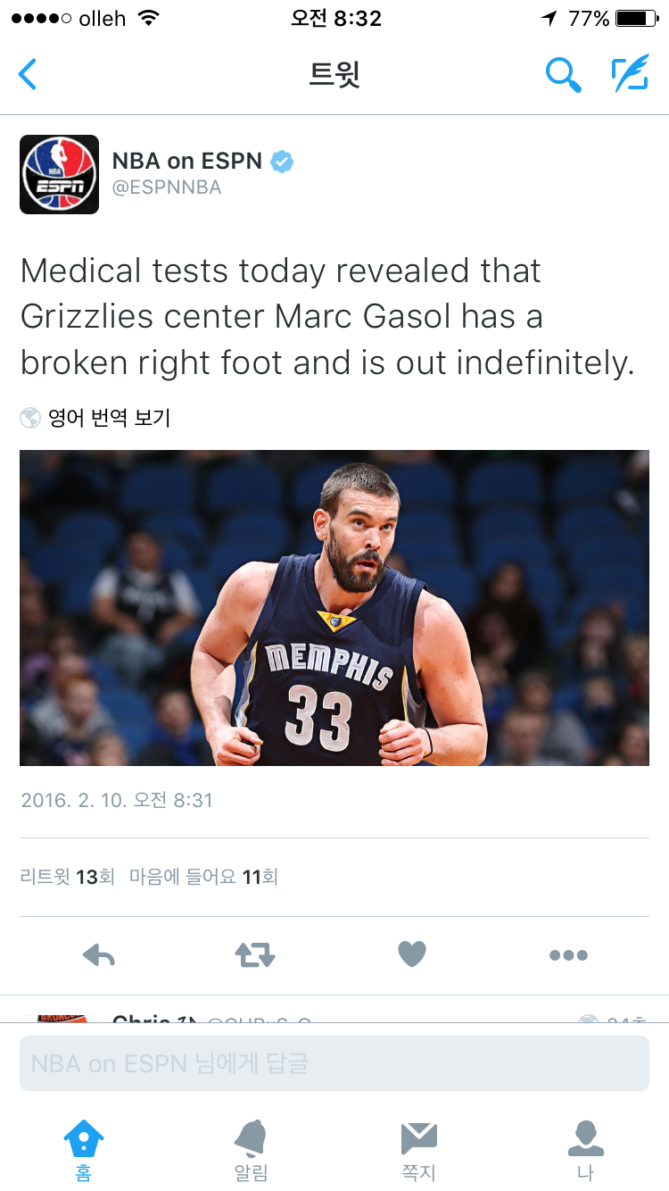 마크 가솔이 오른쪽 발 골절상으로 무기한 아웃이랍니다. 현재 시즌 아웃 가능성도 제기 되는 상태입니다. (오피셜이 아닐뿐 사실상 시즌 엔딩이라 보여집니다)