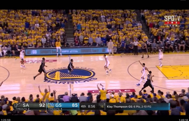 4쿼터 샌안의 공격 작업 중 수비 손에 맞으면서 패스가 굴절되었고 꽤 시간이 지나면서 빨리 넘어가지 않으면 8초 바이얼레이션에 걸리는 상황이 나올 뻔 했죠.