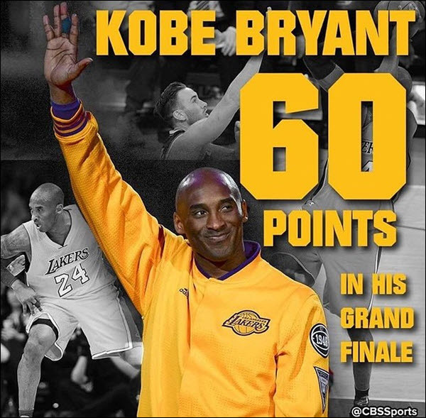 이 날 은퇴경기에서 무려 60점을 쏟아부으며 정말 코비답게 온몸을 불살랐던 그의 농구인생에 멋지게 마침표를 찍었습니다.