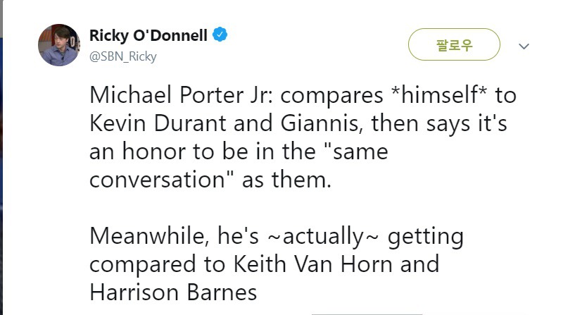 듀란트보다 피지컬이 좀 더 좋고, 쿰보보다는 슛이 좋다고 평가했습니다
