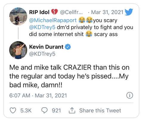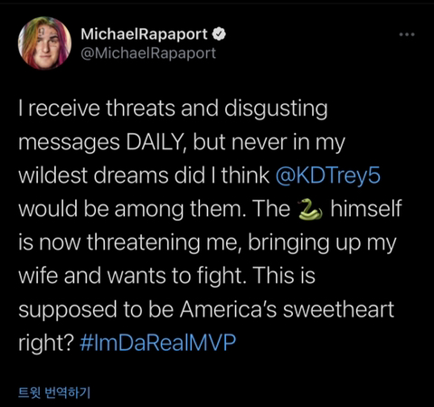 라파포트는 ‘난 매일 위협과 역겨운 메세지를 받는다. 하지만 케빈 듀란트가 그 중 하나일 줄은 몰랐다’며 듀란트와 주고받은 메세지를 공개하였습니다.