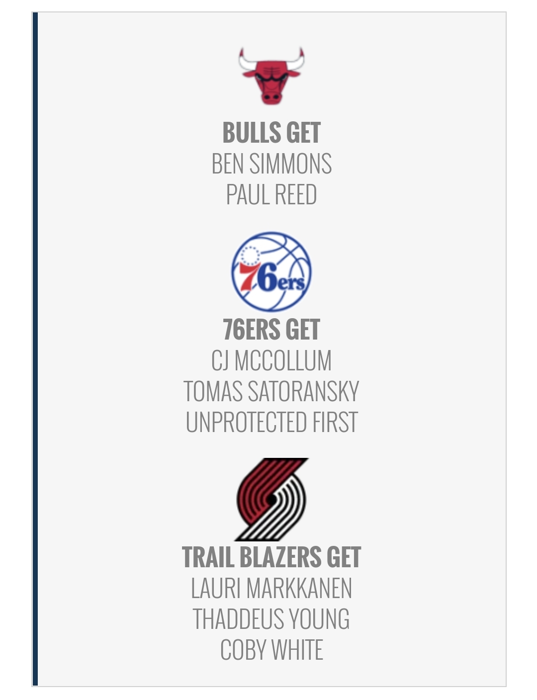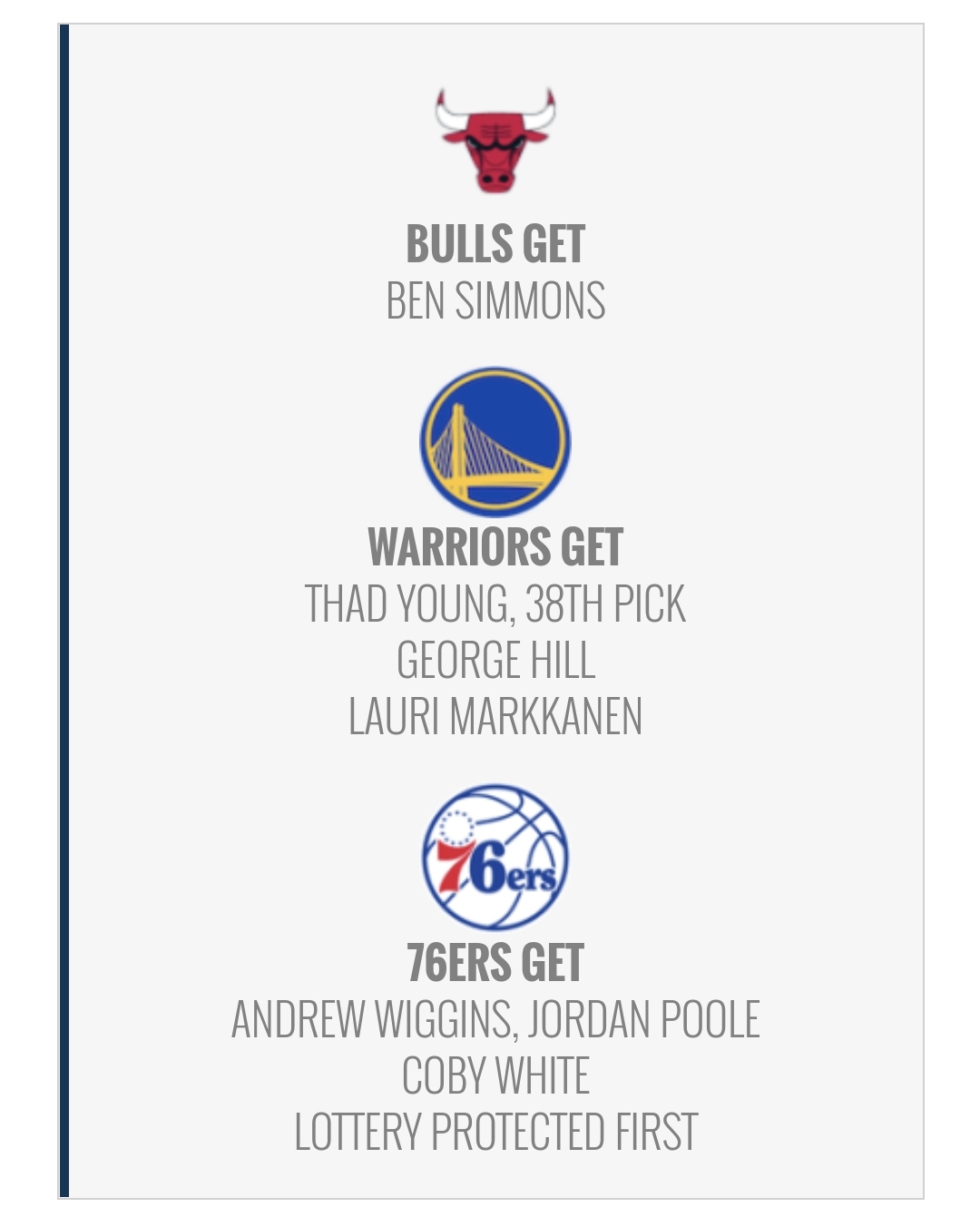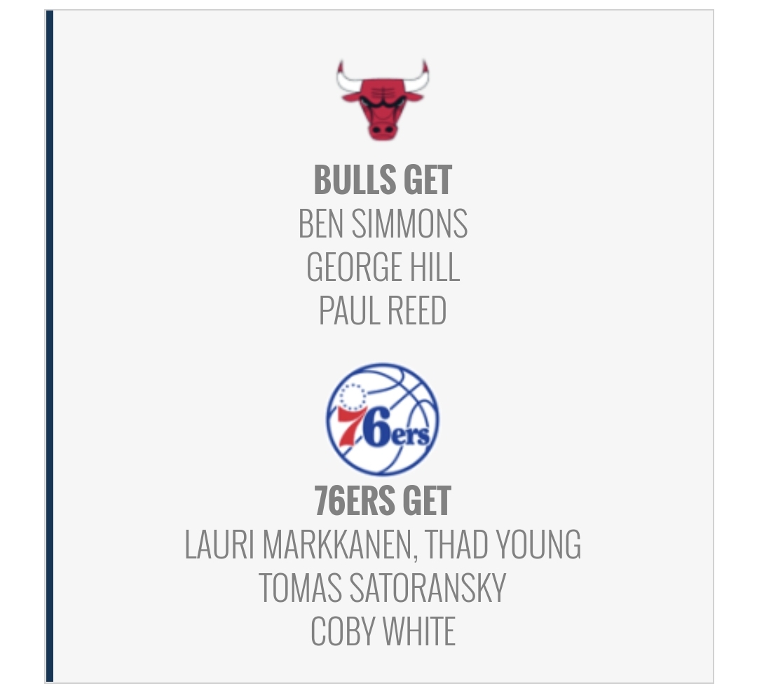 작성자파크마루 작성시간 21.06.26 시카고는 트레이드 자원이 없나보네요. 시몬스 가치가 아무리떨어져도 필리가 저 딜은 받을거같지는않네요..