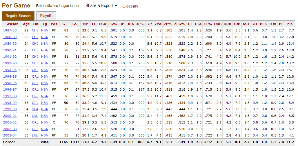 올스타 1번, 올디펜 쎄컨팀 4번 외에는 굵직한 수상 경력도 없고, 어떻게 보면 스탯도 그냥 그렇습니다. 90년대에 많았던 블루워커형 파워포워드 스타일이라고 볼 수 있겠죠.