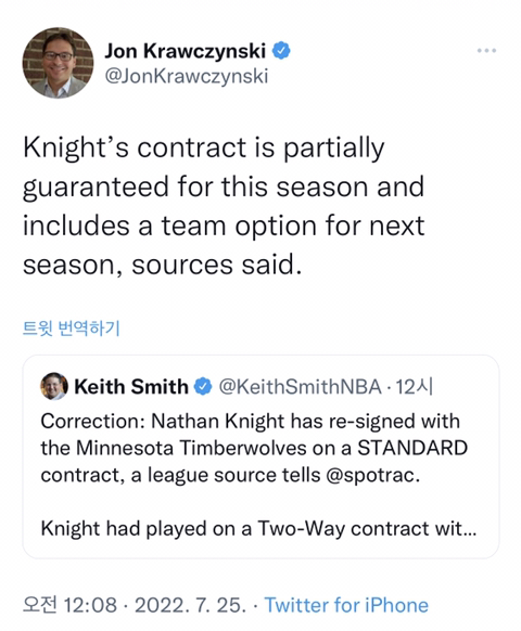 [MIN] 나단 나이트, Wolves와 2년 재계약 합의 작성자(CHI)불타는개고기|작성시간22.07.25|조회수554 목록 댓글 0 글자크기 작게가 글자크기 크게가 첫번째 시즌은 부분 보장, 두번째 시즌은 팀 옵션입니다출처트위터에서 즐기는 Jon Krawczynski“Knight’s contract is partially guaranteed for this season and includes a team option for next season, sources said.”twitter.com 다음검색 현재 게시글 추가 기능 열기 북마크 공유하기 신고 센터로 신고 댓글 댓글 0 댓글쓰기 답글쓰기 댓글 리스트