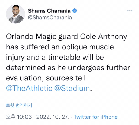 [ORL] 복사근 부상을 입은 콜 앤써니 (샴즈) 작성자(CHI)불타는개고기|작성시간22.10.27|조회수534 목록 댓글 1 글자크기 작게가 글자크기 크게가 정밀 검사 후 복귀 일정이 결정될 예정입니다아마 요부위 말하는듯 다음검색 현재 게시글 추가 기능 열기 북마크 공유하기 신고 센터로 신고 댓글 댓글 1 댓글쓰기 답글쓰기 댓글 리스트 작성자천호동동 | 작성시간 22.10.28 이 정도면 진짜 터를 옮기든, 의료진을 교체하든 뭐라도 좀 하는 게 댓글 전체보기